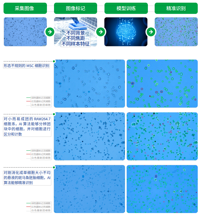 Countstar Mira FL Plus 全自動(dòng)細(xì)胞熒光分析儀采用 AI 人工智能學(xué)習(xí)算法和深度學(xué)習(xí)算法 , 對(duì)細(xì)胞多個(gè)特征進(jìn)行識(shí)別模擬學(xué)習(xí),經(jīng)過整合分 析后,可對(duì)多種類型細(xì)胞樣品進(jìn)行精準(zhǔn)識(shí)別和準(zhǔn)確分析 , 例如:對(duì)形態(tài)不規(guī)則、易成團(tuán)、大小不均一的細(xì)胞進(jìn)行精準(zhǔn)識(shí)別等,滿足廣泛的 應(yīng)用功能需求。