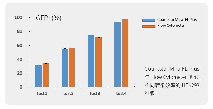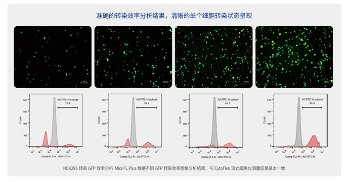 轉(zhuǎn)染效率作為細(xì)胞株開發(fā)和篩選,病毒載體開發(fā)與大規(guī)模生產(chǎn) 的重要環(huán)節(jié),已成為制約藥物開發(fā)的關(guān)鍵因素之一。因此,高 效、便捷的定量檢測(cè),提升細(xì)胞或病毒的轉(zhuǎn)染效率,就成為基 因治療行業(yè)亟待解決的問題。Countstar Mira FL Plus 細(xì)胞分析 儀不僅可得到媲美流式細(xì)胞分析儀的精準(zhǔn)定量檢測(cè)結(jié)果,還可 獲得基于圖像的細(xì)胞分析結(jié)果;提升轉(zhuǎn)染效率的同時(shí),簡(jiǎn)化和 加速病毒載體開發(fā)與生產(chǎn)的流程,助力基因治療藥物的研發(fā)和 商業(yè)化進(jìn)程。