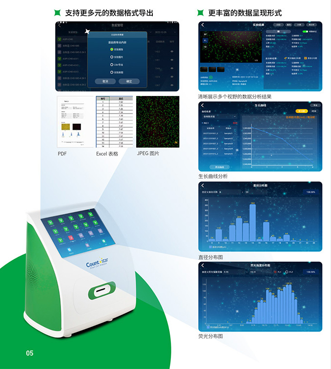 Countstar Mira FL Plus 不僅可以為您提供細(xì)飽的濃度、活率、直徑、結(jié)團(tuán)率等重要細(xì)胞測(cè)量指標(biāo),并且可以根據(jù)培養(yǎng)期間的細(xì)胞點(diǎn)徑分布圖、 生長(zhǎng)曲線、PDF 報(bào)告等直觀圖示,助您了解和掌握細(xì)飽生長(zhǎng)狀態(tài),優(yōu)化細(xì)胞培養(yǎng)條件。