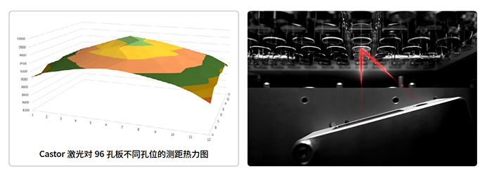 不同品牌的耗材或者 96 孔板的不同孔位所在平面及厚度是有差異的。Castor 通過(guò)激光測(cè)距快速掃描, 對(duì)每個(gè)耗材的平面和厚度誤差進(jìn)行精確測(cè)量,并在拍攝位置自動(dòng)修正平面和厚度,確保所有孔位清晰成像。