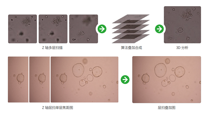 Countstar Castor 能夠?qū)|(zhì)膠中類器官進(jìn)行 Z 軸層掃和圖像疊加合成,并通過(guò)大圖拼接方式實(shí)現(xiàn)整個(gè)膠滴多層 類器官的全部成像和清晰呈現(xiàn),充分保證分析結(jié)果的準(zhǔn)確性和完整性。