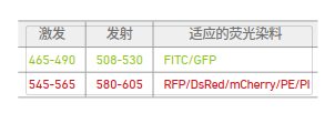 EX : 480/30nm EM : 535/40nm EX : 540/25nm EM : 620/60nm |
